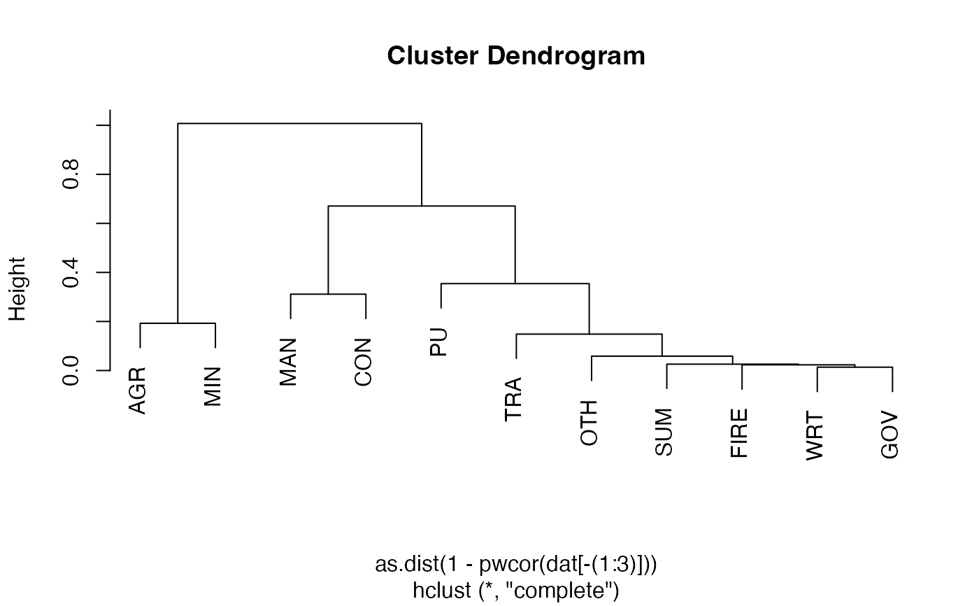 plot(hclust(as.dist(1-pwcor(dat[-(1:3)])))) # Using corrs. as distance metric to cluster sectors